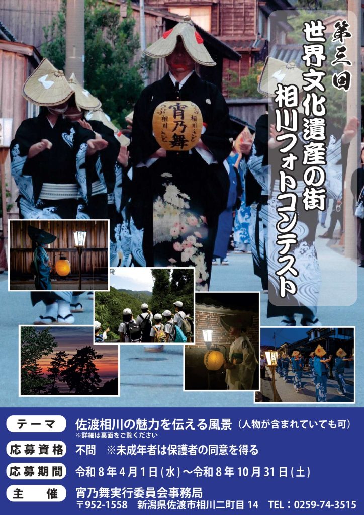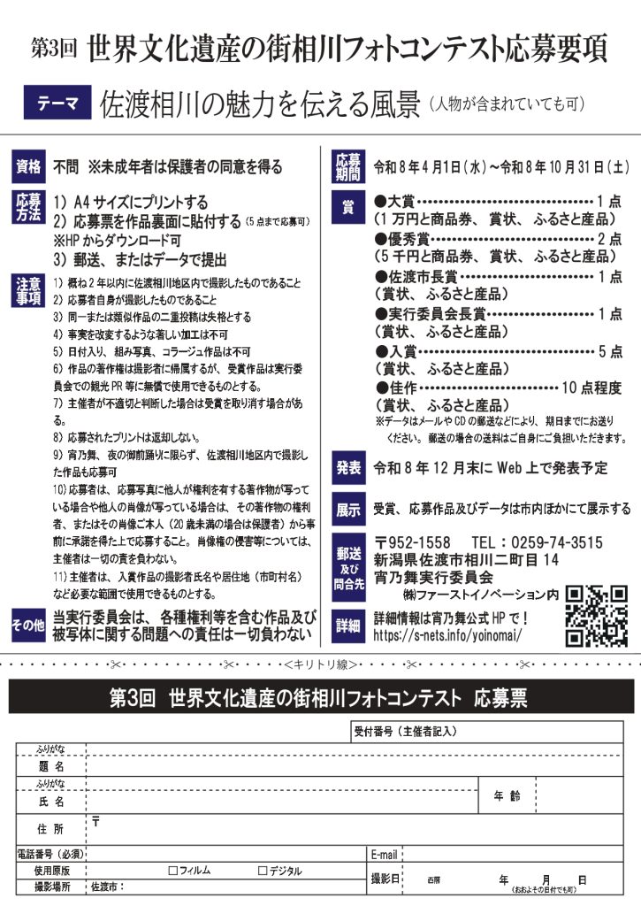 新着情報 令和8年(第三回)世界文化遺産の街相川フォトコンテスト開催 1stino 2026年2月4日 第3回 世界文化遺産の街相川フォトコンテストを開催いたします!!詳細は下記画像リンクよりご覧ください。