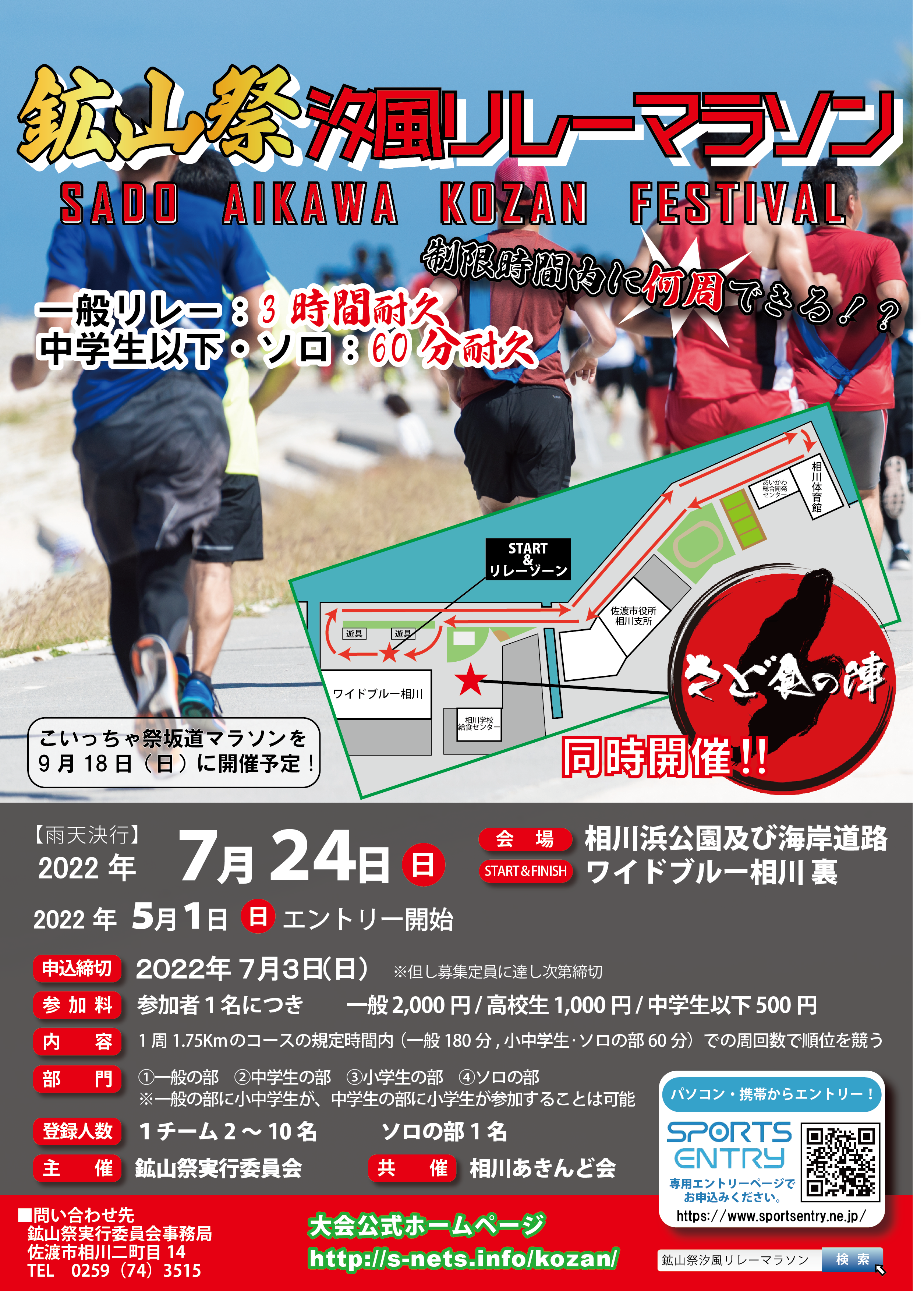 | 賞典 | ①競技後、「完走証」(タイム・順位等記入)を発行します。※リレーはチームで1枚。 ②表彰式は全チームゴール後浜公園ステージにて行います。1位~3位まで副賞あり。 ③各種目1位~3位入賞者は鉱山祭公式HPでも発表いたします。 ④同時開催の「佐渡食の陣」お食事券など、景品多数用意。 ⑤仮装ランナー大歓迎!優れた仮装と認められた場合には景品を差し上げます。 |