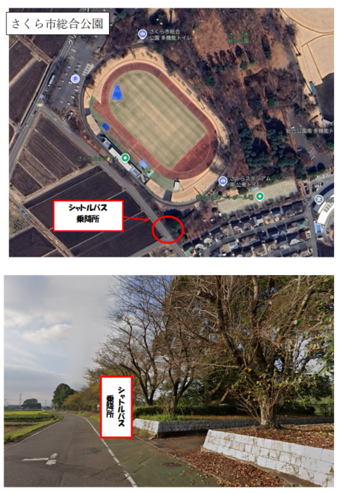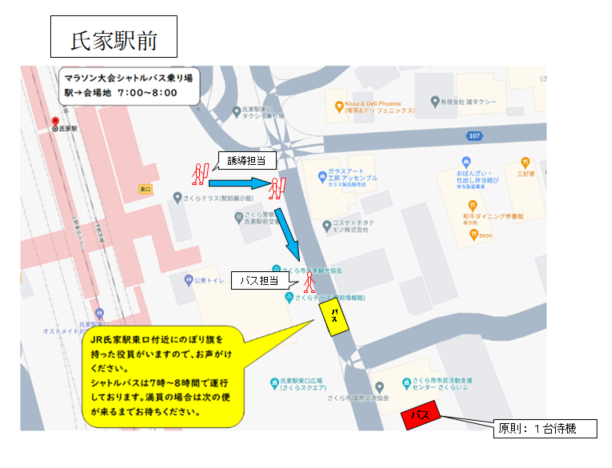 ※大会当日はJR氏家駅東口にのぼり旗を持った係員がいますのでシャトルバス乗降所が不明の場合は係員へお尋ねください。