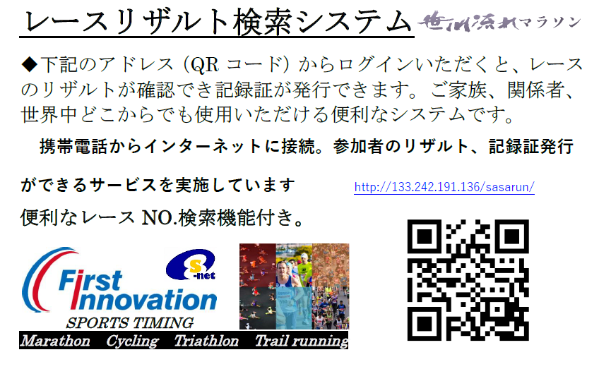 第38回笹川流れマラソン 記録証発行 2026年4月13日 最終更新日時 : 2026年4月13日 wpmaster 下記二次元コードまたはURLから参加者の記録を確認することが可能です。参加者の皆様はぜひご活用ください。